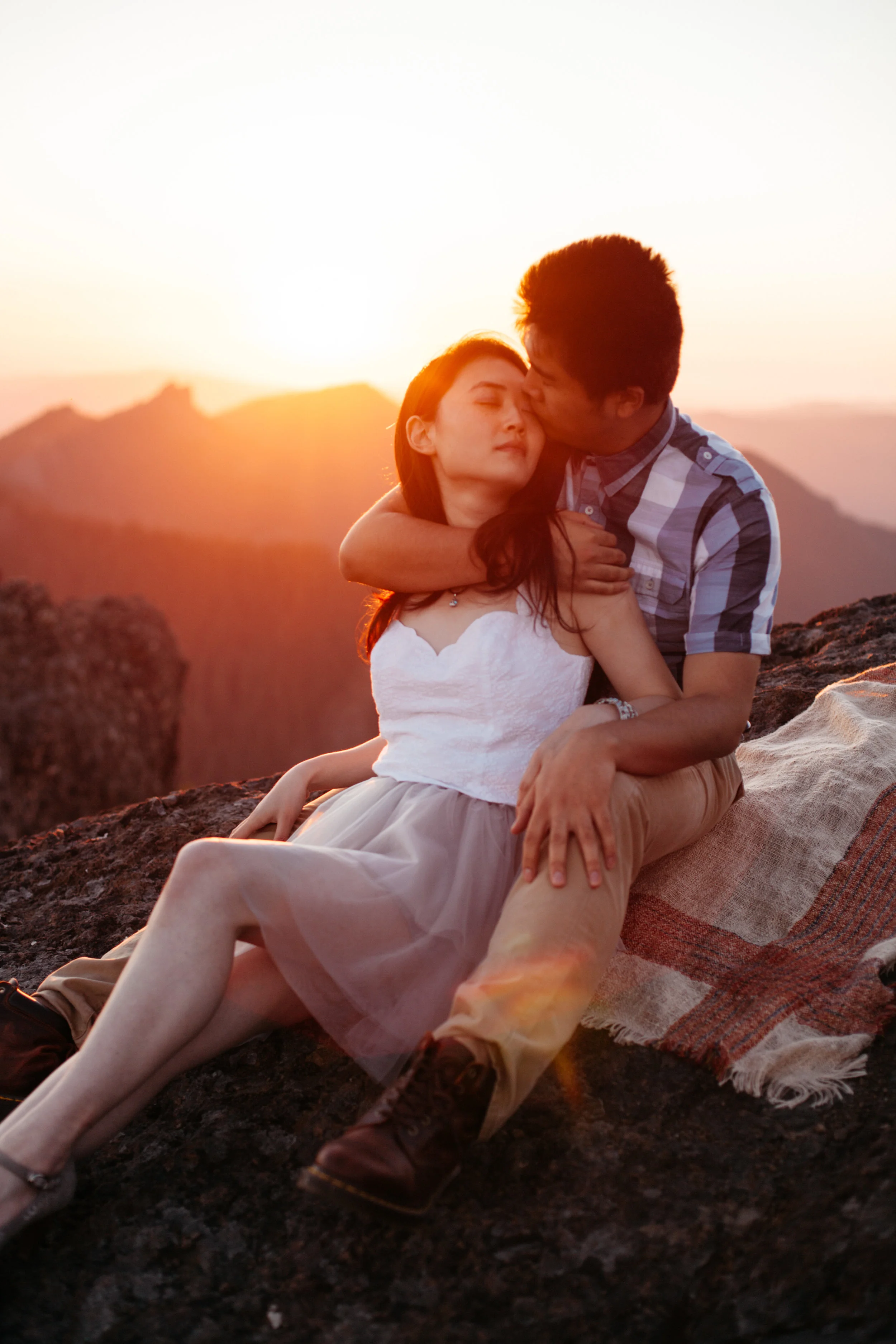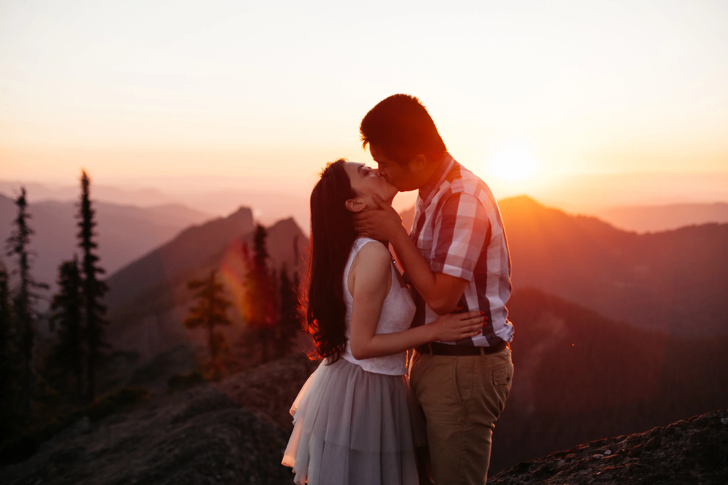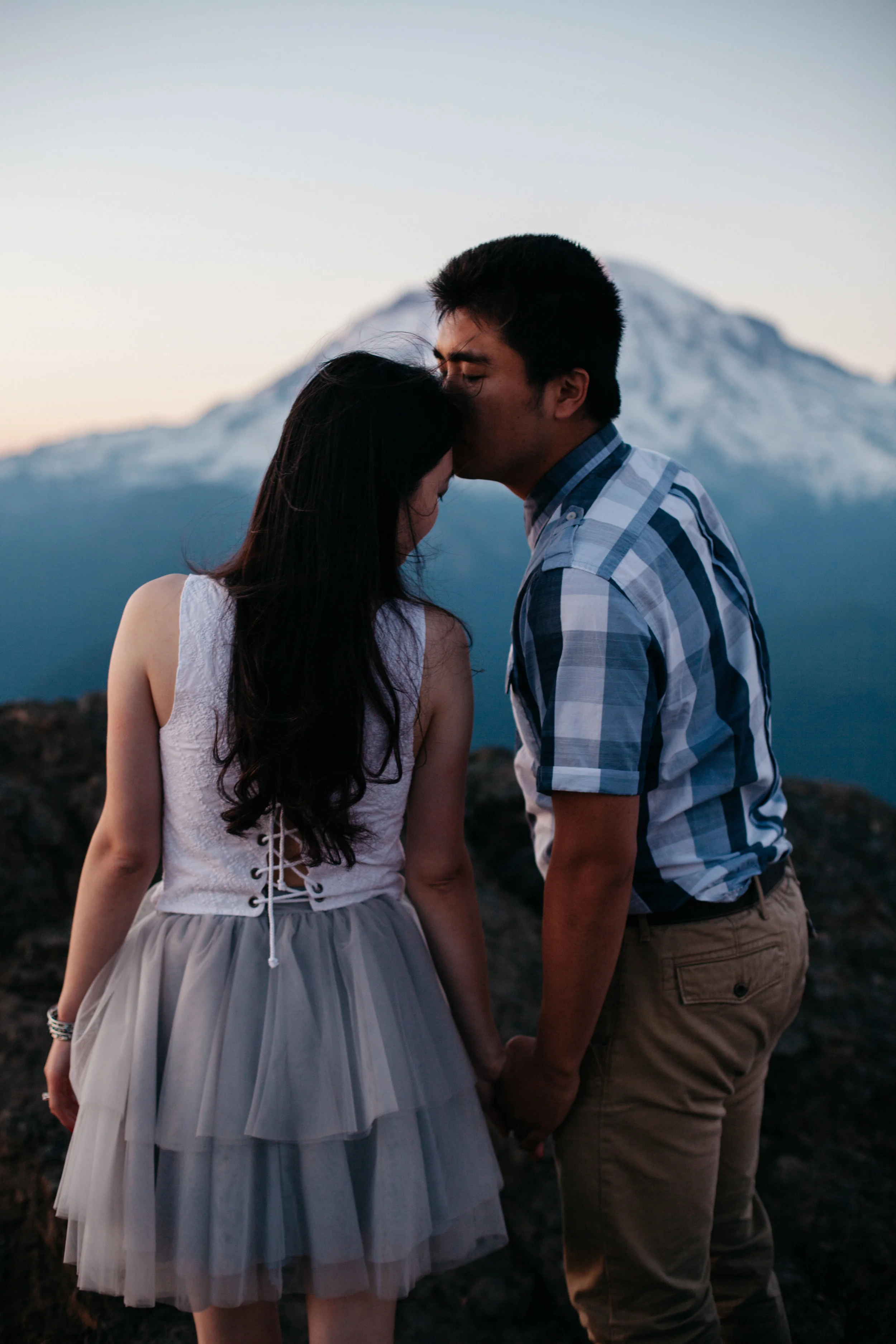 Yanbo and Fei met in kindergarten. She forgot her pencil one day, and, seeing that he had a whole box of pencils, asked Fei if she could borrow one. He promptly said no, and she proceeded to not like him for the rest of the year. They went to the same school though, and were in the same friend group all growing up. When they were both trying to decide where to go to university in America, they began to reconnect and started chatting about school, and eventually they were inseparable. They have been planning their wedding for a while, but Fei never properly proposed, always saying that it would happen, but, as the date grew closer and closer, Yanbo began to doubt whether or not he would actually pop the question. They did pick out a ring together, though, and Yanbo wore it for the engagement photoshoot. For the photos, we hiked up to High Rock, and were greeted by an amazing view of Mt. Rainier. When we were shooting the photos, Yanbo and Fei were cuddling on the cliffs, watching the sun go down and when we were done, Fei requested that Yanbo take off the ring so he could put it safely back into the box. As soon as she returned it, he got down on one knee and told her that she was the girl that he would like to watch all of the sunsets with, and asked her to marry him.
