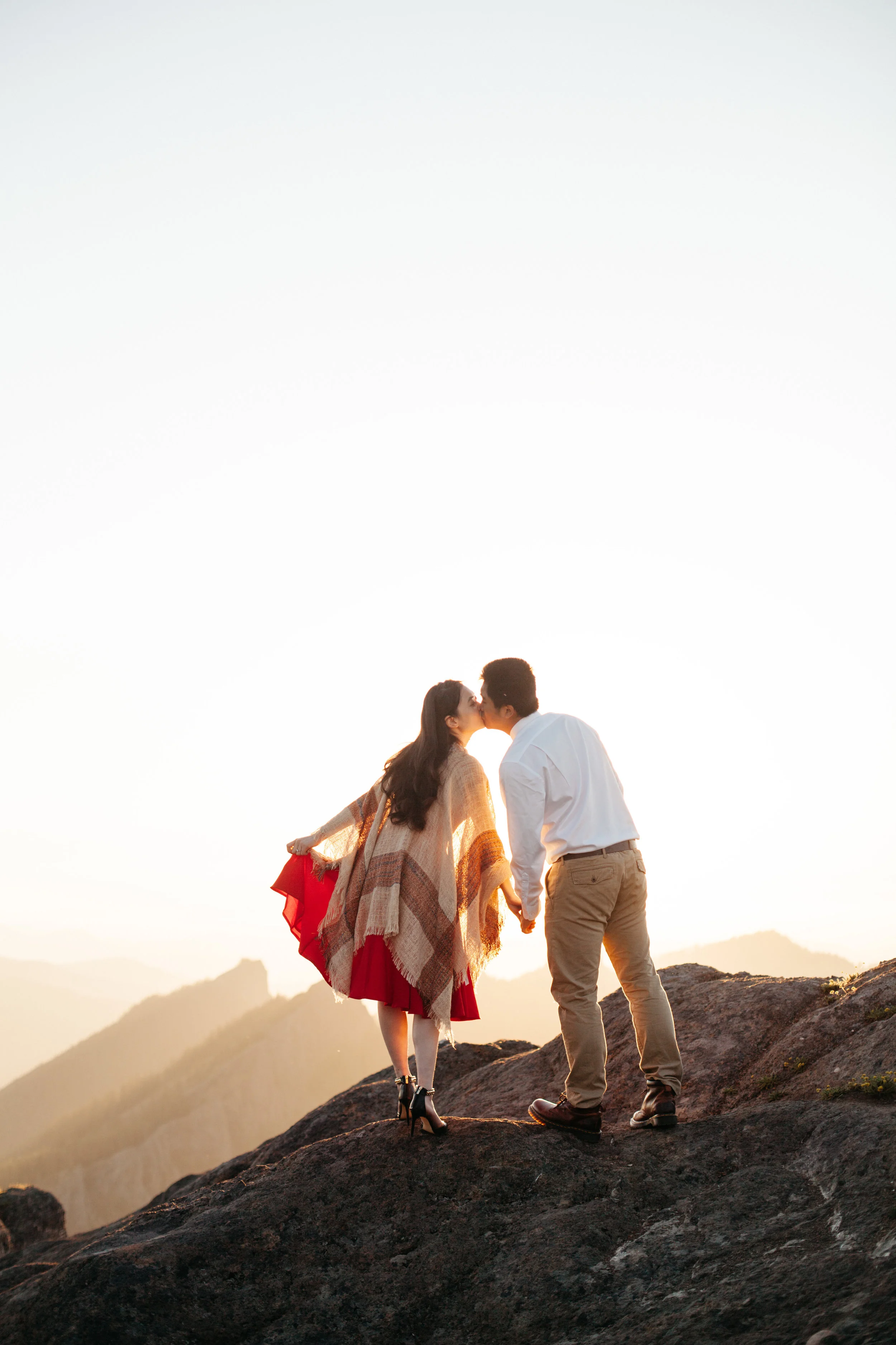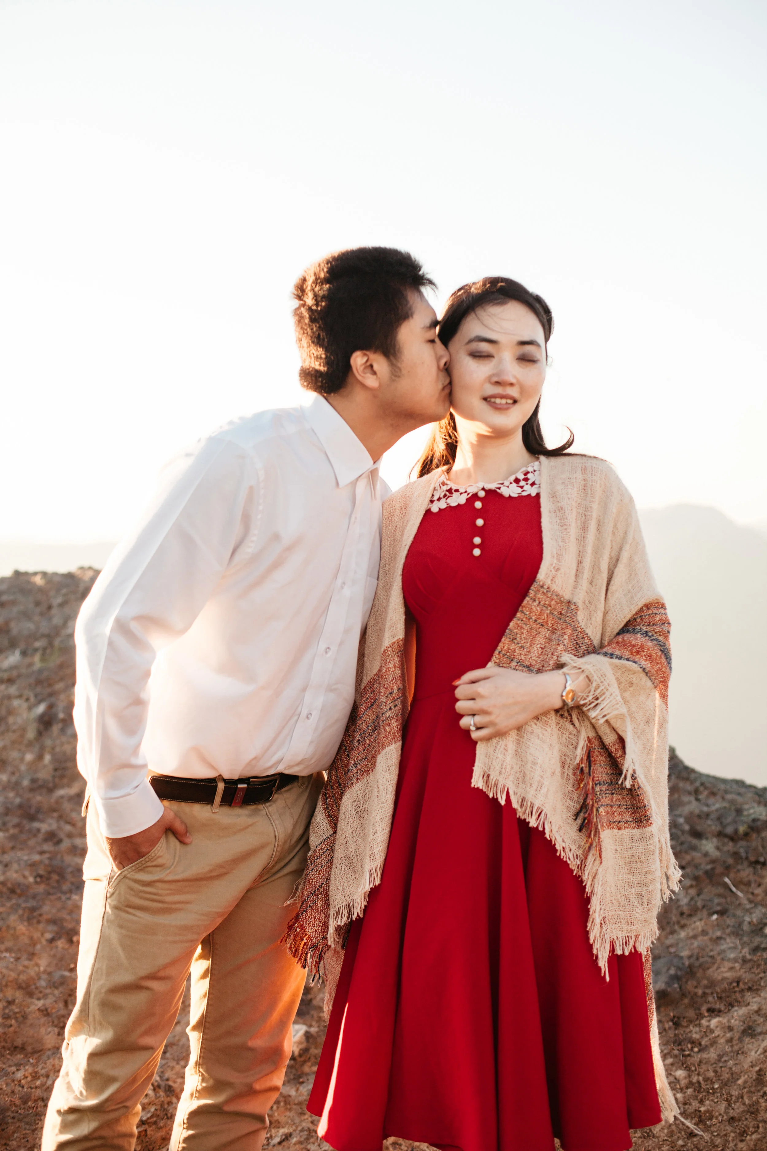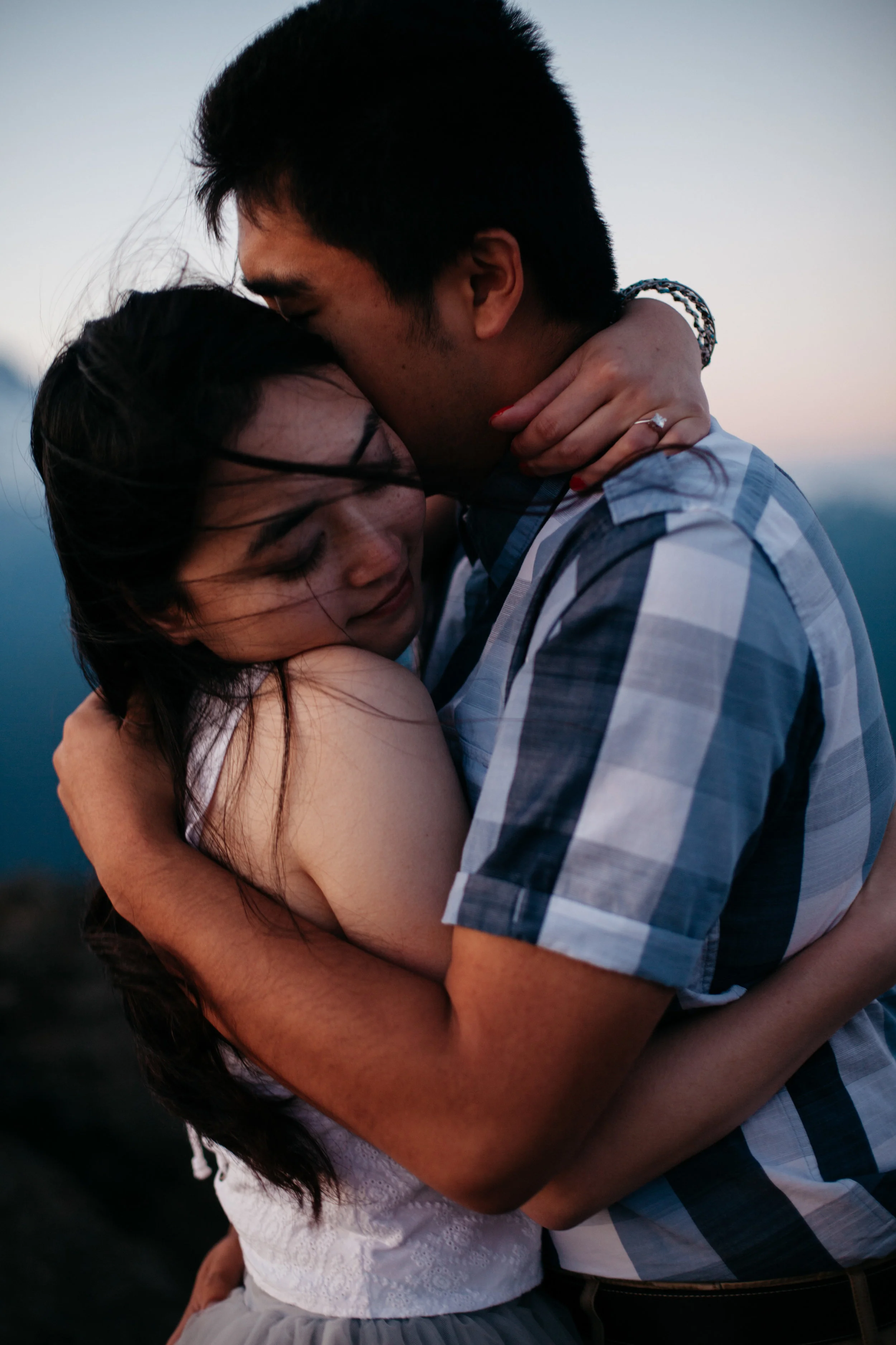 Yanbo and Fei met in kindergarten. She forgot her pencil one day, and, seeing that he had a whole box of pencils, asked Fei if she could borrow one. He promptly said no, and she proceeded to not like him for the rest of the year. They went to the same school though, and were in the same friend group all growing up. When they were both trying to decide where to go to university in America, they began to reconnect and started chatting about school, and eventually they were inseparable. They have been planning their wedding for a while, but Fei never properly proposed, always saying that it would happen, but, as the date grew closer and closer, Yanbo began to doubt whether or not he would actually pop the question. They did pick out a ring together, though, and Yanbo wore it for the engagement photoshoot. For the photos, we hiked up to High Rock, and were greeted by an amazing view of Mt. Rainier. When we were shooting the photos, Yanbo and Fei were cuddling on the cliffs, watching the sun go down and when we were done, Fei requested that Yanbo take off the ring so he could put it safely back into the box. As soon as she returned it, he got down on one knee and told her that she was the girl that he would like to watch all of the sunsets with, and asked her to marry him.